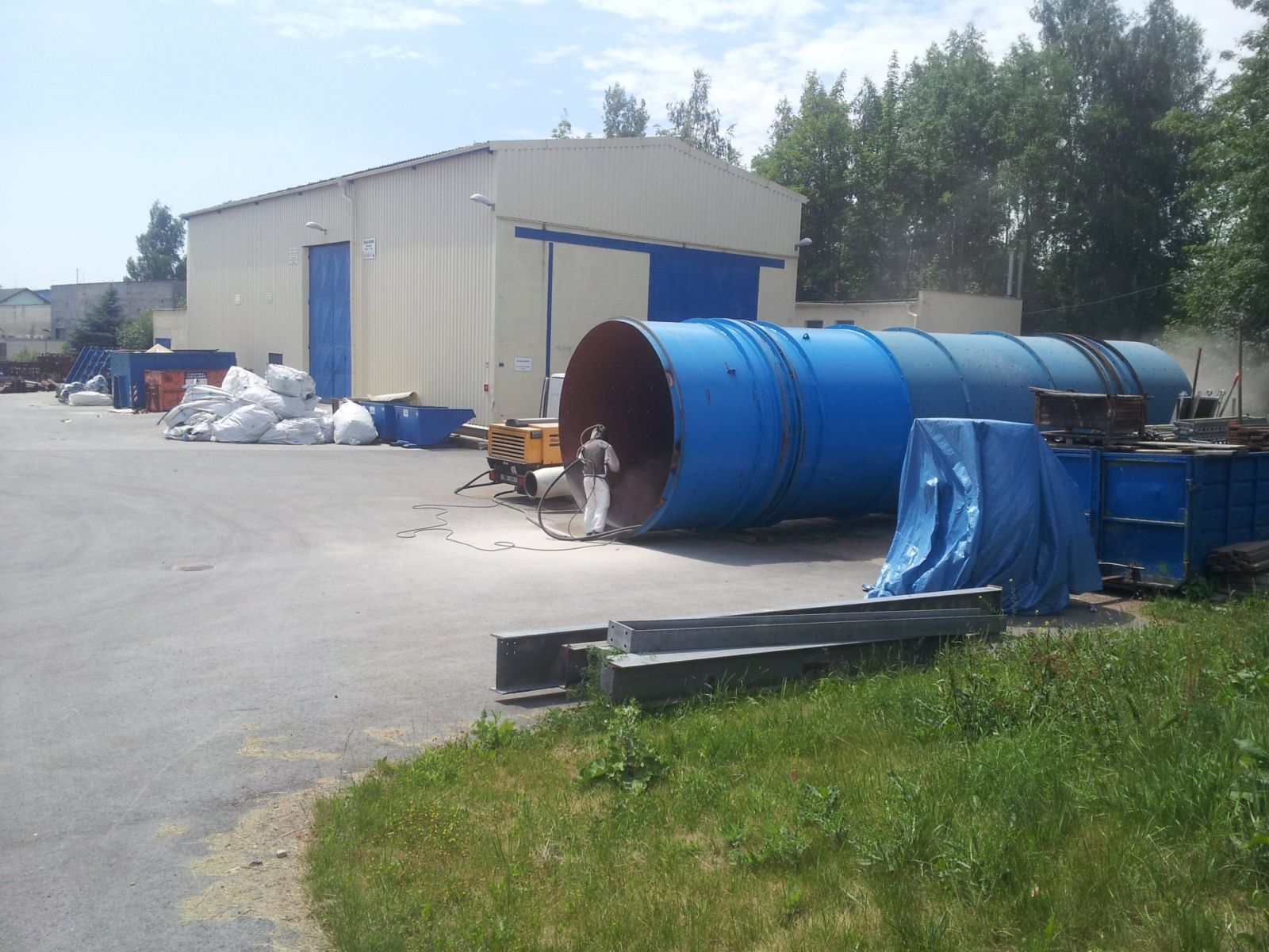 Tryskáme ocelové mosty, ocelové profily a konstrukce, betonové nádrže, betonové mosty, zásobníky krmných směsí, zemědělské stroje a zařízení, vleky, návěsy a součásti automobilů, potrubí, kovářské výrobky, nátěry na výrobcích, cihly, beton, kamen, schody, památky, sklo atd.